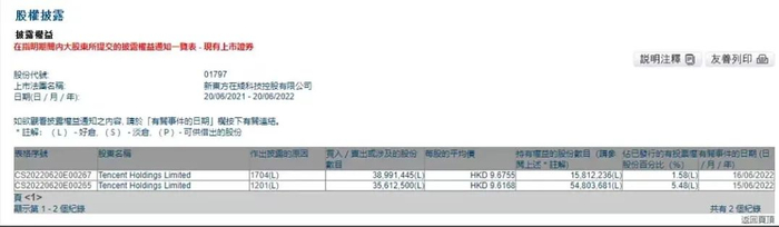 其中,6月15日,腾讯控股出售了3561.25万股,占持股比例的5.48%,出售均价为9.618港元/股。