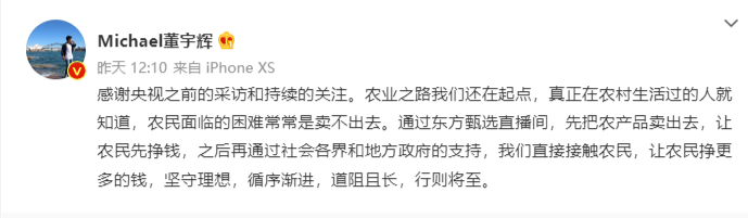 董宇辉6月19日发微博称,农业之路我们还在起点,真正在农村生活过的人就知道,农民面临的困难常常是卖不出去。通过东方甄选直播间,先把农产品卖出去,让农民先挣钱,之后再通过社会各界和地方政府的支持,我们直接接触农民,让农民挣更多的钱,坚守理想,循序渐进,道阻且长,行则将至。