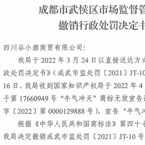 为了维护权益,今年3月谷小酒向国家知识产权局商标局提出“牛气冲天”商标撤销连续三年不使用注册商标与无效宣告的申请。最终,今年4月22日,国家知识产权局作出裁定,宣告“牛气冲天”商标无效。