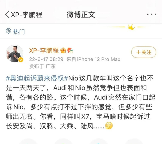 奥迪这次的操作也未得到业内的支持与理解,同为中国本土汽车品牌的小鹏汽车副总裁李鹏程更是在微博高调声援蔚来,他表示奥迪有些师出无名,打不过下绊子,还提到同样叫X7,怎么没见宝马起诉欧尚、汉腾等一众车企。