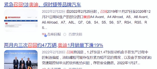 值得一提的是,奥迪在产品质量的把控上,似乎也存在问题。据市场监管总局官网数据显示,自2021年9月以来,奥迪在中国市场已经进行了6次召回,召回总车辆数达57.5万辆,最多的一次单次召回便超过了45万辆,其中有进口奥迪,也有国产奥迪,召回的原因主要是产品缺陷,包括但不限于车辆行驶中动力或中断等严重安全隐患。