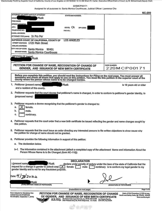 马斯克的18岁儿子薇薇安·詹娜·威尔逊近日向洛杉矶高等法院提交申请,希望改掉自己的姓氏“马斯克”,为的是要断绝与其大名鼎鼎的父亲马斯克之间的亲子关系。据法院申请截图显示,薇薇安·詹娜·威尔逊在4月18日,也即自己刚刚达到法定成年的18岁的之后一天就提交了这份改名的申请。