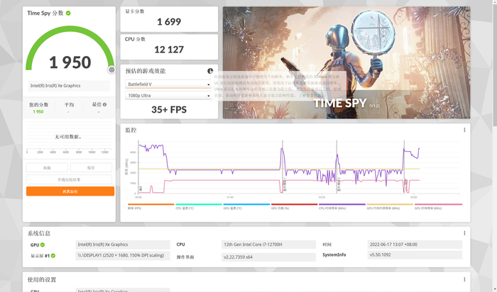 这里小K评测室采用了3DMark作为测试的基准,从这个表现中,可以看出如果是运行中高负载的游戏(比如堡垒之夜、PUBG等),即便是在1080P下,它也无法以60帧运行。