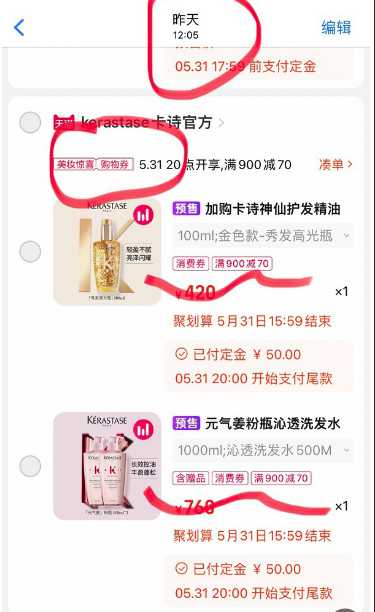 广西河池消费者小雪在“6·18”活动预售期间,也被卡诗天猫旗舰店的促销活动吸引,并支付定金100元,购买了卡诗神仙护发精油和元气姜粉瓶沁透洗发水。她告诉《中国消费者报》记者:“美妆券叠加平台的满减券,价格还是挺优惠的,我是为了凑够900元可以使用满减券专门加购的,没想到5月31日付尾款时,这个券就消失了。”随后,小雪向卡诗提出退差价,被客服拒绝。