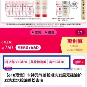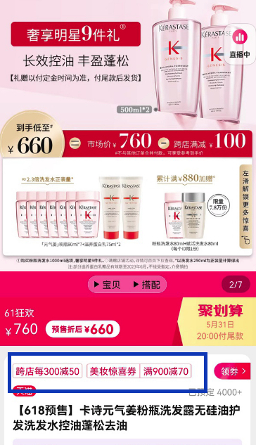 ▲卡诗天猫旗舰店显示可以使用满900减70购物券。本文图片:资料图