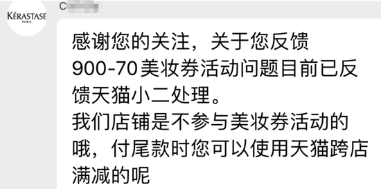 记者就此事询问卡诗天猫旗舰店客服。客服回复称“关于您反馈900减70美妆券活动问题,目前已反馈给小二处理”,此后便没了下文。