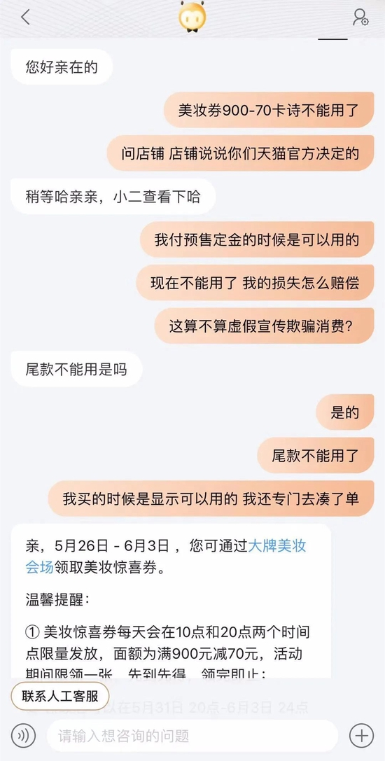 湖南长沙消费者陈女士对《中国消费者报》记者投诉:“今年‘6·18’从5月底就开始预售了,5月26日,我看到卡诗天猫旗舰店可以使用满900减70的美妆惊喜购物券,于是挑选了两样商品并预付了定金共100元,5月30日,却突然发现满900减70的券不能用了。”