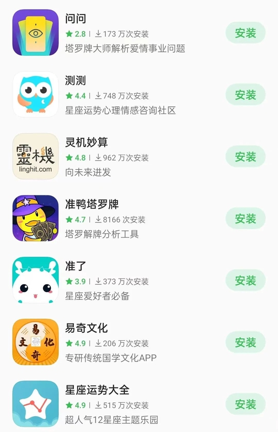 关于玄学的软件也十分丰富,在软件商店中关于命理学的软件达到了300多个,其中下载最多的已经超过了900万次,种类涵盖了从星座塔罗到八字占卜的大部分命理测量。