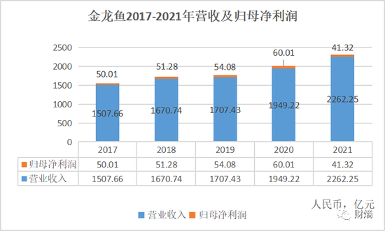 2021年,金龙鱼实现营业收入2262.25亿元,同比增长16.06%;利润总额同比下降 30.9%至61.8 亿元,归属于上市公司股东的净利润同比下降 31.1%至 41.3 亿元,扣非净利润同比下降 43.2%至50.0 亿元;