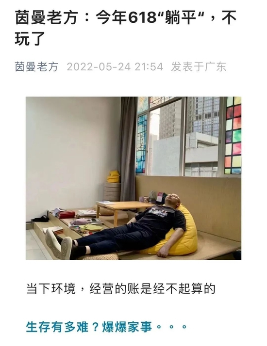 时隔八年多,2022年618前夕,方建华发了一篇文章——《今年618“躺平”,不玩了》。他呼吁平台也好,品牌也好,抛弃层层促销套路,也不要再盯着GMV了,那个一再被冲高的数字背后,是越来越高的退货率,疲惫的商家、消费者,和疫情之下本就艰难的营商环境。
