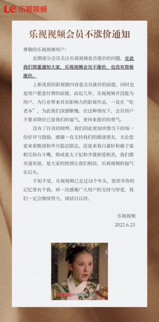 【TechWeb】6月23日消息,在“爱优腾”纷纷宣布涨价后,乐视视频今日下午发布会员不涨价通知,称乐视视频会员不涨价,也没有资格涨价。