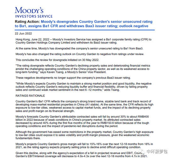 简单说就是将碧桂园的评级从Baa3下调至Ba1.