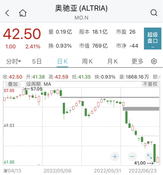 受此消息影响,拥有Juul 35%股权的烟草巨头奥驰亚集团(旗下有万宝路等品牌)周三大跌,回吐年内所有涨幅,周四小幅反弹,截至最新,市值769亿美元(约5149亿人民币)。奥驰亚在2018年时斥资128亿美元收购前述股份,到今年初已经将这笔投资减值到16亿美元。摩根士丹利重新评估了Juul电子烟禁售令对其的影响,并维持对奥驰亚的“减持”评级。