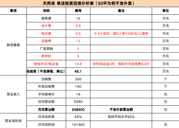 天然呆单店投资回报分析表。图片来源:受访者提供