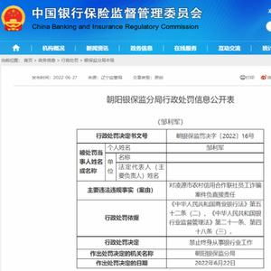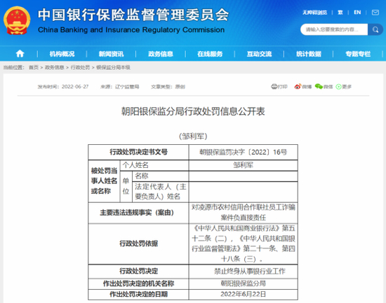 6月27日,银保监会辽宁监管局官网披露,由于邹利军对凌源市农村信用合作联社员工诈骗案件负直接责任,将被禁止终身从事银行业工作。