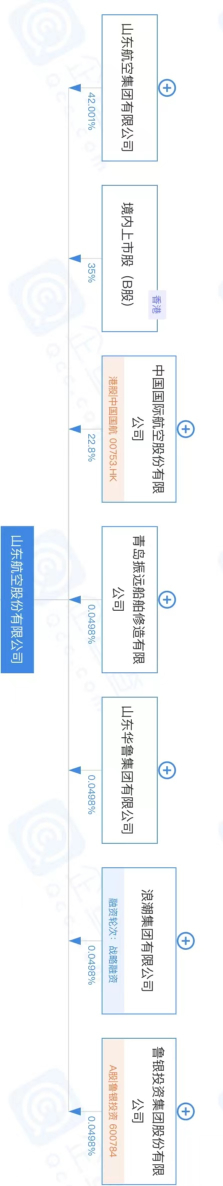 目前山航集团持有山航股份42%的股权,国航持有22.8%,其他未上市流通股股东0.2%,B股股东35%。