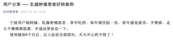 慈孝堂公司官方宣传显示,宁波用户陈阿姨,乳腺肿瘤患者,常年吃药,每年需住院一次,常年感觉疲劳。使用模块(黄金模块)8个月后,以上症状全部消失。