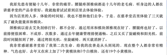 《产品可靠性报告》在慈孝堂公司官方公众号发现,其通过老人现身说法之经历宣称,其磁灸床、旋磁椅、阳光机等产品堪称“神品”,糖尿病、高血压、牛皮癣、老年痴呆、恶性肿瘤等顽疾都经过磁疗后康复。