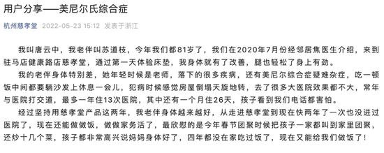 慈孝堂公司官方宣传显示,驻马店的81岁老人,通过慈孝堂产品治好了美尼尔综合症疑难杂症。快两年了没再进过医院。