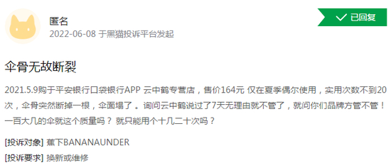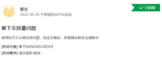 但是蕉下控股产品质量问题依然存在。有消费者在第三方投诉平台黑猫投诉反馈称,所购蕉下雨伞存在掉色、伞柄影响使用、伞骨无故断裂等情况。