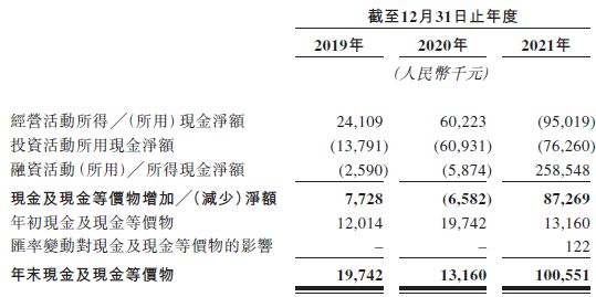 按理来说,随着公司业务量的增长,公司的经营活动现金流应该较为充裕。据招股书显示,蕉下控股2021年的经营活动现金流为-9501.9万元。