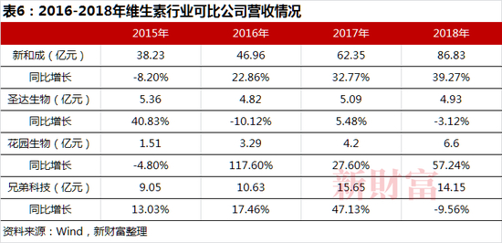 2016-2018年,维生素价格上涨,企业利润增厚,在此期间,新和成的营收增速分别为23%、33%以及39%,同期花园生物的营收增长高达118%、28%以及57%(表6)。