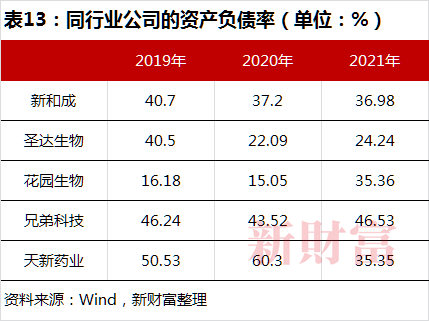 2018-2020年,天新药业的资产负债率分别为50.36%、50.53%、60.3%,显著高于新和成、花园生物等同行(表13)。