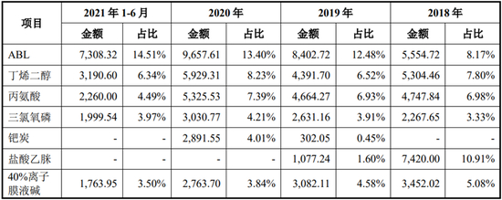 ABL(α-乙酰基-γ-丁内酯)主要用于合成维生素B1,为天新药业采购成本占比最大的原料。2018年至2021年上半年,ABL单价从32元/千克涨至48元/千克,涨幅达50%,在其采购成本中的占比也从8%升至15%(表3)。