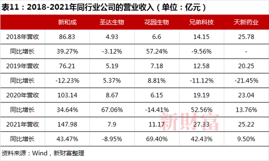同样身处维生素领域,新和成、兄弟科技、圣达生物、花园生物在2018-2021年期间营收基本都实现了60%-100%的增长,相比之下,天新药业营收则在原地踏步。而从估值来看,天新药业预估32倍的市盈率接近圣达生物,是新和成、花园生物的2倍,仅次于兄弟科技(表11)。