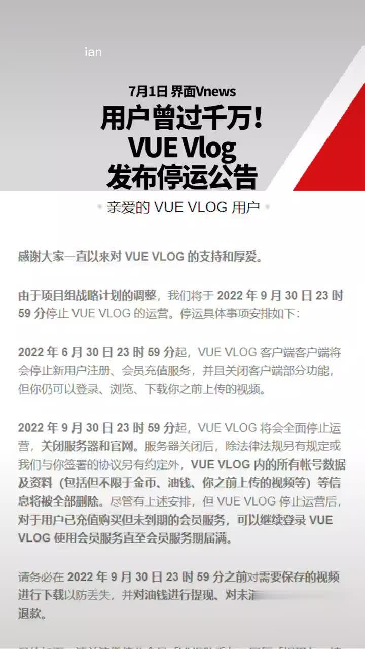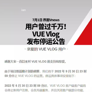 6月30日晚,@VUEvlog 通过微信公号宣布将停止运营,目前已于各大应用商店下架。7月1日起,VUE VLOG停止新用户注册、会员充值服务,并且关闭客户端部分功能。已注册用户仍可登录、浏览、下载之前上传的视频。购买的会员服务可继续使用至服务期届满。9月31日起,VUE VLOG将会全面停止运营。