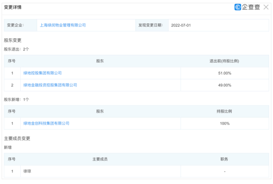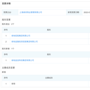 此次股东变更,绿地控股与绿地金融退出,绿地金创进入全资持股;同时,新增了一位名为徐琼的成员进入绿闵物业。