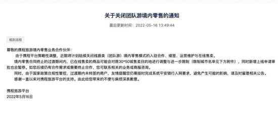 当天,在一个携程跟团游商家群里,他们接到了一则通知。通知内容显示,携程将在近期陆续关闭国内团队游零售模式的入驻、续签与售卖,商家的运营模式将从零售转为代理。