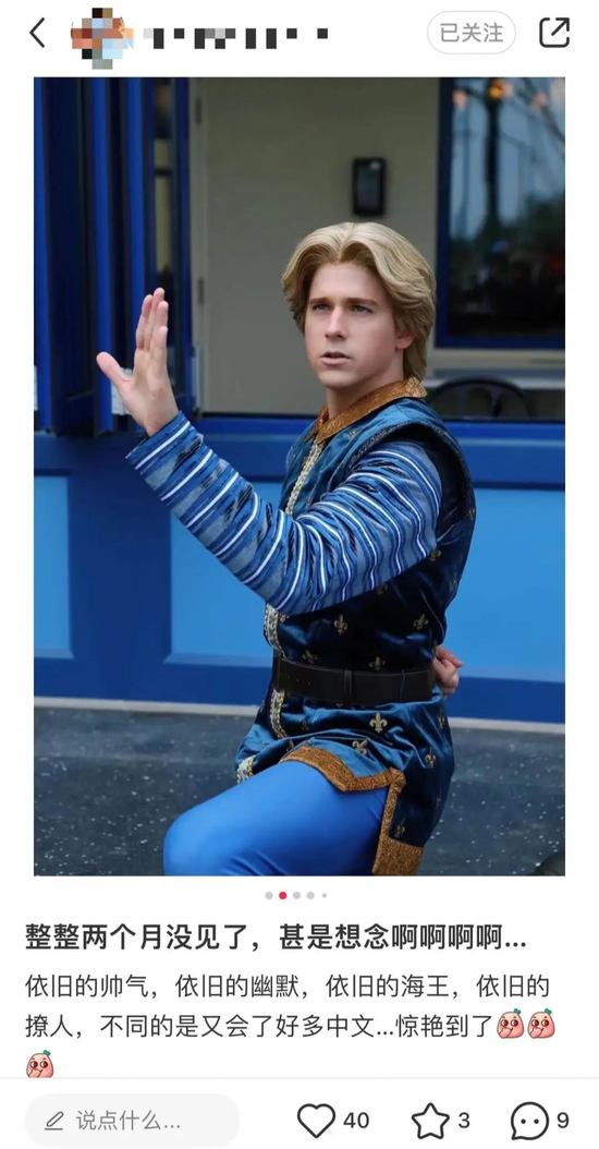 Edwards正是她现在去环球影城的原因。“我在小红书私信Edwards,问他的演出时间。我之所以6月30日去,就是因为那天轮到他表演这个角色。”据她介绍,Charming王子是北京环球影城特有的IP,由三个演员表演,Edwards是其中之一。