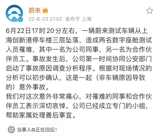 6月23日晚,他从蔚来官方通报中得知了这个坏消息。车内两名数字座舱测试人员罹难,其中一名为蔚来员工,另一名为其合作伙伴员工。