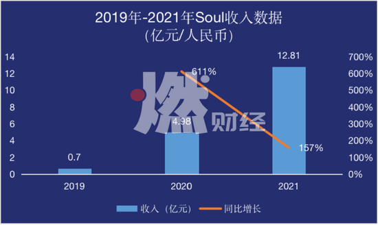 2021年,Soul全年营收为12.81亿元(人民币,以下未标注则同),较2020年同比增幅为157%。然而,看似已超150%的增幅,与2020年同比超600%的营收增幅相比,已是天壤之别。