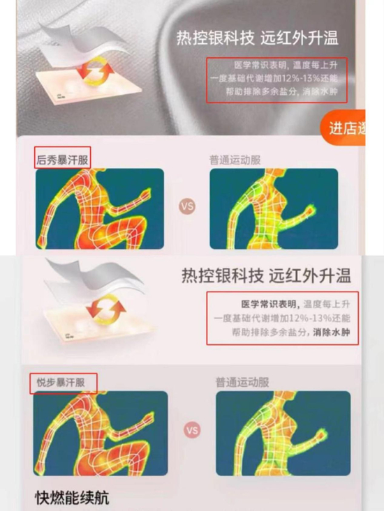 其中在悦步的天猫店铺商品详情页面中,使用了与后秀相似的产品图片,均借助“医学常识”说明,“温度每上升一度基础代谢增加12%-13%还能帮助排除多余盐分,消除水肿”。