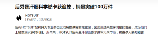 后秀还找来了权威机构发布的文献背书。在天猫店铺商品详情页面,后秀宣称穿着暴汗服运动消耗更多卡路里,引用美国运动委员会ACE、韩国龙仁大学以及上海体育学院学者的文献报告加以佐证。上海体育学院2021年针对HOTSUIT后秀暴汗服进行的一组实验表明,受试者穿着HOTSUIT后秀暴汗服时的运动能量消耗,相较于穿着普通运动服最大可提升10.1%;穿着后秀HOTSUIT暴汗服运动后的静息能量消耗最大提升29.5%。