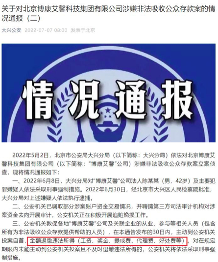 上述通报还表示,公安机关敦促各地博康艾馨公司及关联企业的从业、参与等相关人员(包含所有为非法吸收公众存款提供帮助的人员),在本通告发布的30日内,主动到公安机关投案自首,全额退缴违法所得(工资、奖金、提成费、代理费、好处费等),否则公安机关将依法采取刑事强制措施。