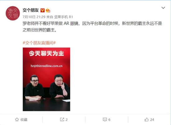 同时,罗永浩在跟网友聊天中谈到了苹果 AR。罗永浩称,自己并不看好苹果做 AR 眼镜,因为平台革命的时候,新世界的霸主永远不是之前旧世界的霸主。值得一提的是,罗永浩曾表示,其相信苹果一定会在硬件或者技术参数方面做出其他厂商都做不到的某些硬核指标,但对苹果的产品创新基本没什么期待。在乔布斯去世后的十一年里,苹果仅在无线耳机方面做得不错,其他产品几乎是零创新甚至退步。