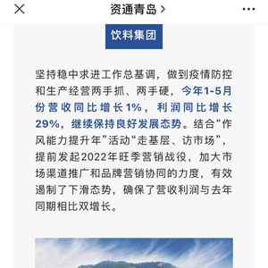 而在上述会议上,王达也表态称,青岛饮料集团将实现‘二次创业’倍增计划新突破,争创全国行业领军企业,品牌价值向千亿级迈进,擦亮‘老品牌新金花’靓丽的“城市名片”。