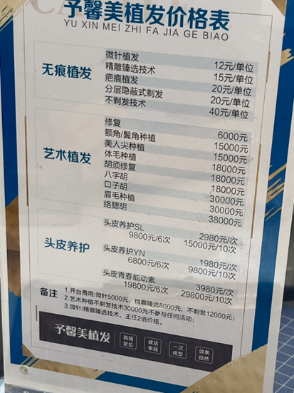 此外,“予馨美植发”的价格分微针植发、精雕臻选技术、疤痕植发、分层隐蔽式剃发和不剃发技术,销售人员称其给出了权限内最大折扣八折后,植发所需缴纳的价格分别为19872元、24840元、33120元和57960元,此外还需缴纳配套的术前检查和术后护理包1280元。