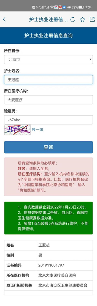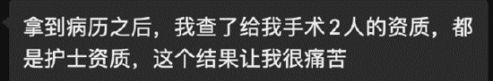 王强告诉新浪财经,其在护士执业注册信息查询网站上发现,给其操刀做手术的医生其实是护士身份,“这个结果让我很痛苦。”