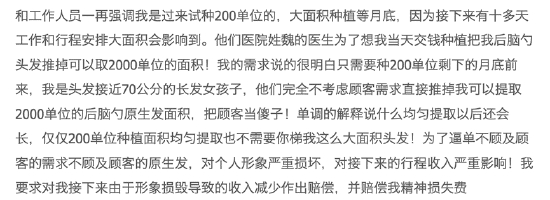 但大麦植发未经该消费者同意,擅自剃掉其后脑勺大面积头发,取了大概2000个毛囊单位,但其实只有200个毛囊单位是免费的。该消费者称,其工作涉及直播和内容,因为剃头影响形象无法完成工作,只能选择辞职。