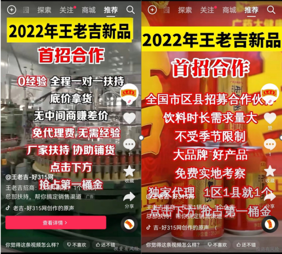 有意思的是,一边是投诉维权者众多,而另一边则是市场上依然存在着大量以王老吉、广药集团名义的招商公司在吸引新的代理商乱象,譬如在抖音、快手以及各大资讯平台上,《红周刊》很容易就找到有关王老吉新品的招商广告,且这些广告内容基本上与维权代理商描述的一致。