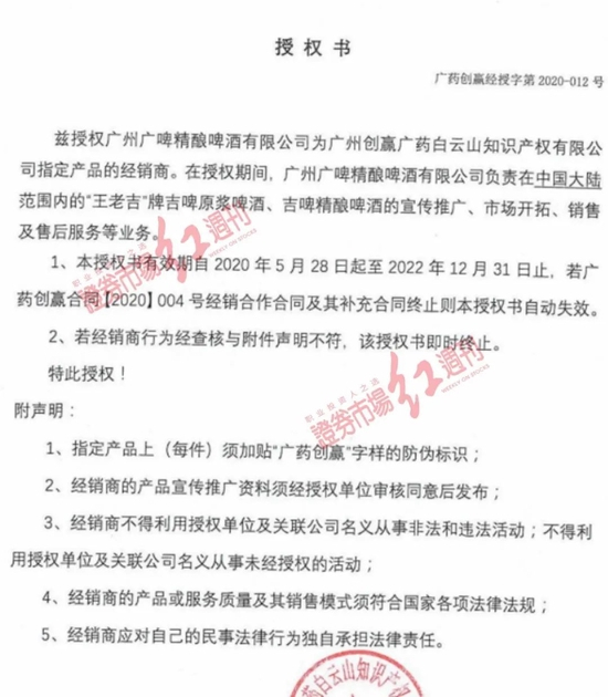 《红周刊》调查发现,这些招商公司的授权书确实出自“广药系”公司,并衍生出授权再授权的把戏。以江苏淮安周女士等人签约的广东盛远健康产业有限公司(简称“广东盛远公司”)为例,白云山的全资子公司广州创赢广药白云山知识产权有限公司(简称“广州创赢公司”)授权湖南百仕吉健康产业有限公司(简称“湖南百仕吉公司”)为其指定产品的代理商,在授权期间,湖南百仕吉公司负责“王老吉”牌“吉泉”大凉啤啤酒的宣传推广、市场开拓、销售及售后服务等业务。而湖南百仕吉公司又进一步将“王老吉”牌“吉泉”大凉啤啤酒授权给了广东盛远公司。