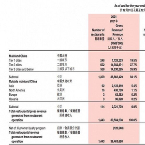 与中国内地地区的高速扩张相比,海底捞的海外业务发展似乎并没有高歌猛进。与其2020年底93家门店数量相比,2021年新增的大陆以外门店数量为21家。而从年报数据分析看,海底捞海外业务的占比不算高。