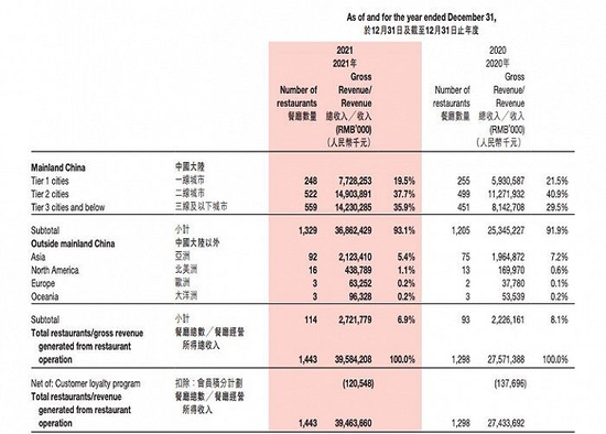截至2021年12月31日,海底捞在全球开设1443家直营餐厅,其中1329家门店位于中国内地,114家门店位于中国香港、中国澳门、中国台湾及其他海外市场。