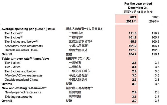 但同时,海外门店的翻台率却更低。对比2021年中国内地餐厅整体3.0次/天的翻台率,中国内地以外餐厅的整体翻台率仅为2.3次/天。