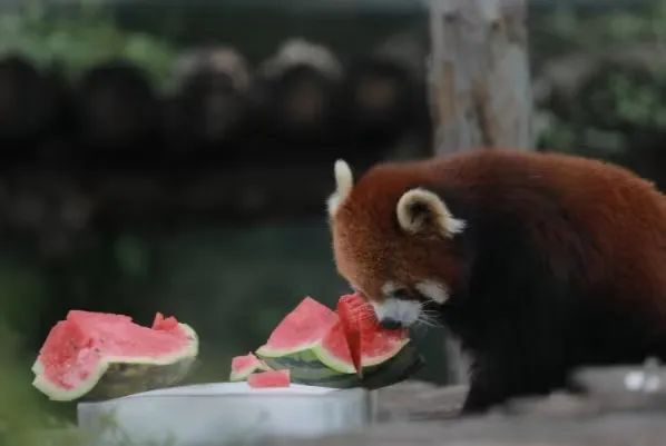 北京动物园的小熊猫在吃“冰镇西瓜”。王汉琦/摄