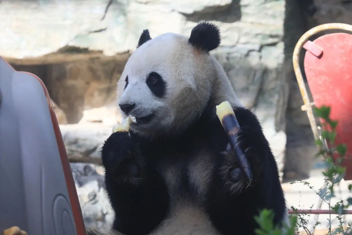 大熊猫“福星”在吃竹子。王汉琦/摄
